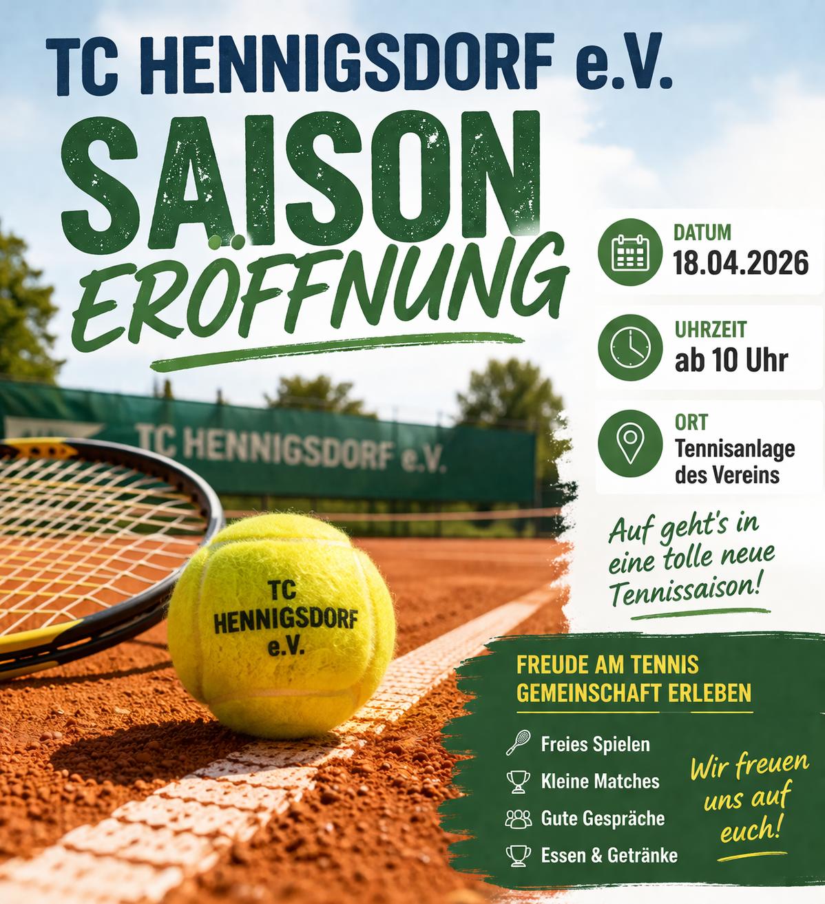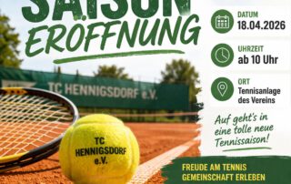 Die Winterpause ist vorbei – wir schlagen wieder auf! Der TC Hennigsdorf e.V. lädt euch herzlich zur großen Saisoneröffnung 2026 ein. Wir freuen uns darauf, gemeinsam mit euch in den Frühling zu starten.Wann & Wo?Datum: Samstag, 18. April 2026Start: [weiterlesen...]